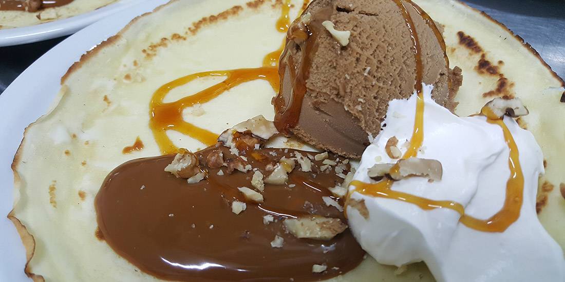 PANQUEQUE Helado, dulce de leche y salsa de chocolate