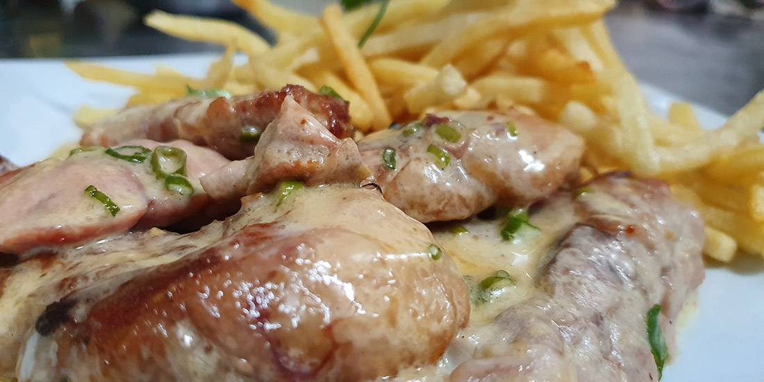 ENTRECÔTE A LA FRANCESA Crema amostazada al chardonnay y hongos en guarnición de papas gratinadas